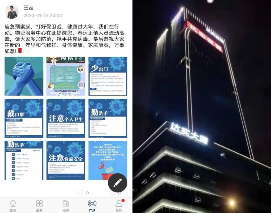 達實大廈不僅是一座綠色智慧的大廈,同時也是一座溫暖的大廈。整棟大廈里面有前臺豎屏、大堂運營大屏、電梯屏、電梯廳魔屏、衛(wèi)生間鏡屏及空中戶外大屏等多種信息發(fā)布渠道。疫情期間,達實物業(yè)服務中心會通過這些樓內(nèi)外的線下宣傳渠道并結合達實大廈APP的線上渠道及時發(fā)布權威機構的疫情預防信息及大廈相關防疫工作的公告,幫助大廈辦公人員及時了解大廈內(nèi)外的疫情防疫動態(tài)。