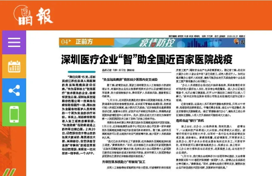“我們只用15天,順利完成江蘇省洪澤人民醫(yī)院的負壓隔離病房建設任務。”作為深圳本土“智慧醫(yī)療”技術領先的企業(yè),自疫情發(fā)生以來,深圳達實智能股份有限公司一直奔走在疫情防控醫(yī)療一線,用科技為全國各地醫(yī)護人員構筑起一個更為安全的診療環(huán)境。事實上,隨著疫情防控進入復工返崗的新階段,“科技防疫”在防疫戰(zhàn)場上的作用日益凸顯。2月20日,記者前往位于南山區(qū)的達實大廈采訪,職員進出大樓、乘梯通行、食堂供餐等全程“零接觸”的場景呈現(xiàn)在記者眼前,實現(xiàn)這一切只需要一部手機、一個APP。據(jù)了解,疫情發(fā)生后,國家工信部曾發(fā)出人工智能協(xié)力抗疫的倡議書,希望科技企業(yè)充分挖掘新冠肺炎診療以及疫情防控的應用場景,助力疫病智能診治,降低醫(yī)護人員感染風險,提高管控工作效率。“1月30日,達實團隊就勇赴武漢雷神山醫(yī)院建設現(xiàn)場,負責全院通道和空間的智能管控系統(tǒng),該系統(tǒng)可管理各通道權限,有效進行病人和病區(qū)的隔離,減少院內交叉感染。”達實智能副總裁黃德強告訴記者,繼雷神山項目,該技術也不斷被應用在佛山、珠海等多家醫(yī)院和疫情防控中心項目中。此外,團隊還在三天三夜內為淮南市第一人民醫(yī)院研發(fā)并上線了發(fā)熱門診線上咨詢平臺。憑借自非典時期以來積累沉淀的負壓隔離病房技術研發(fā)經驗,2月15日,達實智能攜其全資子公司達實久信公開發(fā)表一封申請承擔負壓隔離病房建設或升級改造任務的請戰(zhàn)書。據(jù)了解,這種負壓隔離病房可以防止病房外的空氣被病毒污染,減少醫(yī)護人員被感染的幾率。“我們已動員所有的上下游資源,優(yōu)先確保負壓隔離病房的施工進度。”黃德強表示:“目前,達實智能已為全國近百家醫(yī)院提供‘應急負壓隔離病房’解決方案,包括北京小湯山醫(yī)院等十幾家醫(yī)院已接受達實智能的改造方案和技術裝備,深圳市第三人民醫(yī)院等多家醫(yī)院也已要求達實智能進場實施改造。”采用人工智能等各項高新技術助力防控,對疫情新階段實現(xiàn)有序復工復產,輔助安全生產也具有重要意義。據(jù)記者了解,在達實大廈辦公的12家企業(yè)中有7家已經復工,返崗人數(shù)近千人。如何合理布置辦公場所人流密度,避免可能發(fā)生的交叉感染是每個企業(yè)在復工復產期間最關心的問題之一。“辦公人員進樓后會經過紅外線體溫檢測,其體溫情況將實時同步到大廈前臺人員處,有異常會響起警報。進入辦公區(qū)域無需刷卡,也不必摘口罩刷臉,打開APP隔空掃二維碼可以進入門禁口。”深圳達實物業(yè)服務有限公司物業(yè)總經理范江波向記者介紹道。記者注意到,這里的人員不再親手接觸電梯按鈕,只用APP呼梯、選樓層然后乘梯直達。午餐無需去食堂,通過APP選定餐點,物業(yè)安排樓內無接觸配送。通過“零接觸通行辦公”,避免員工在公共區(qū)域相互接觸,人傳人交叉感染的可能性將大大減小。線上會議、云辦公、AI檢測體溫、物流機器人……疫情當下,一眾高科技產品都進入大眾視線,并逐漸被大眾適應。疫情對傳統(tǒng)行業(yè)有較大沖擊,但同時一些行業(yè)也將在疫情后加速發(fā)展、逆勢增長。黃德強透露,在疫情期間,不再要求員工坐班辦公,兩千多名分布在全國各地的達實員工,只要有手機、有網(wǎng)絡就可以隨時隨地高效辦公,視頻會議、線上培訓……員工辦公的習慣和觀念正在改變,在某程度上說,這也有利于企業(yè)進步。“1月25日,我們捐出全部庫存350臺醫(yī)用凈化器后,又全球調集資源采購7000套防護服捐贈一線醫(yī)護人員。疫情讓企業(yè)深感社會責任重大。”黃德強說:“同時,疫情也給我們帶來啟發(fā),鞭策科技企業(yè)不斷促進技術研發(fā)創(chuàng)新,發(fā)掘新的市場機遇。”